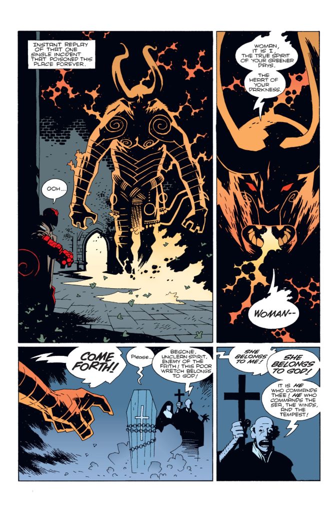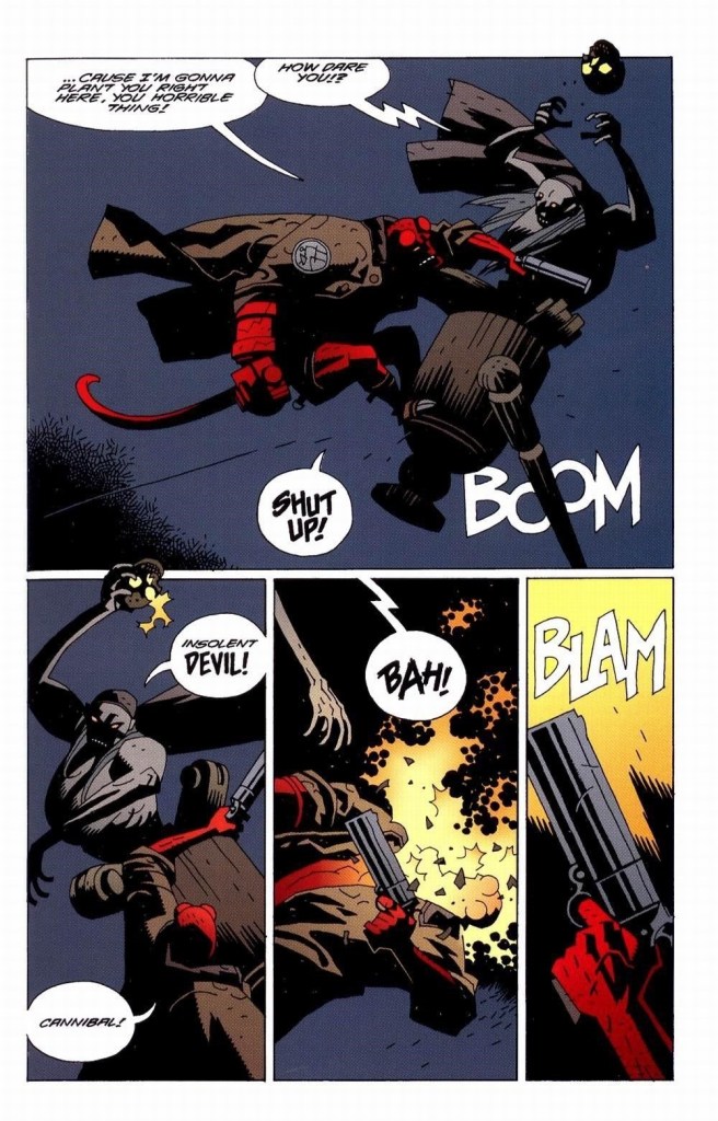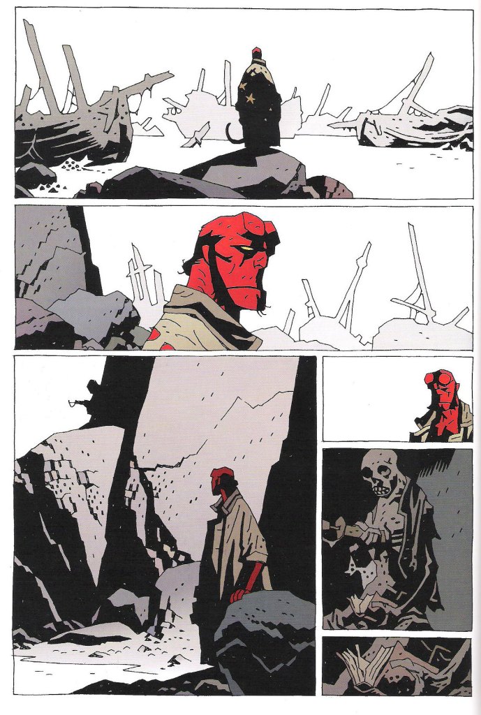 Acerca del arte de Mignola, este mismo se permite agregar pizcas del folclore, las películas de serie B, las historias de fantasmas y monstruos, e incluso mitologías inspiradas en los libros de Lovecraft, en general; un pulp. De aquello, encontramos en Mignola un estilo muy propio, un dibujo tosco con rasgos duros y escenarios oscuros siempre matizados con colores opacos, grises y uno que otro detalle en colores vivos que ayudan a contrastar el relato siempre que lo requiera.
