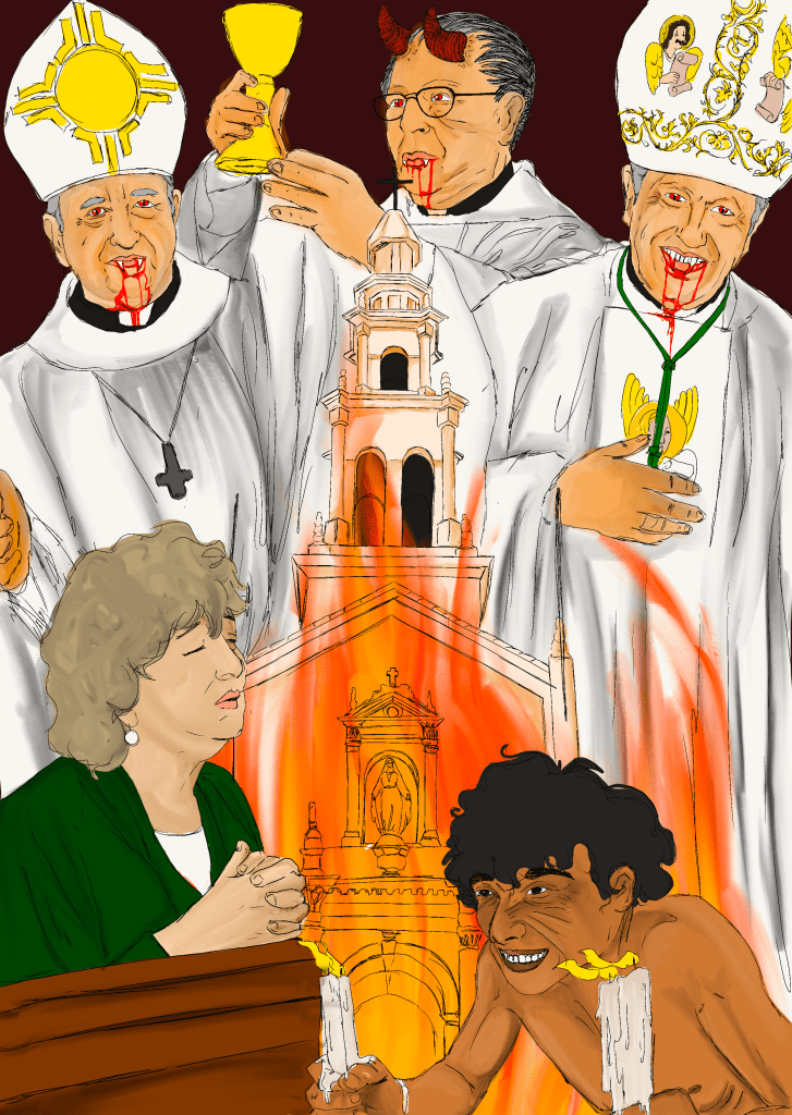Quise retratar a Karadima, Errázuriz y Ezzati en esta ilustración ya que al ser figuras de la iglesia, ellos y muchos más se han encargado de ensuciarla, se cubren con esas sotanas y su cara de ser los voceros de Jesús, dando la palabra de Dios, para engatusar a los feligreses, por eso les puse sangre en sus bocas y unos cuernos porque son demonios disfrazados de santos, también puse a la iglesia en llamas ya que con todo esto cada vez nos da a entender que se está yendo abajo, además en mi opinión “TODA IGLESIA QUE ILUMINA ES LA QUE ARDE”. Puse a dos personas a la típica “vieja cuica” que se pega en el pecho y no hace el bien al salir de la iglesia y a él creyente que cada año va hacer su manda y es una persona humilde y de sacrificio. Todo estos representantes de la identidad Chilena quise ponerlos en forma que se hiciera como un círculo sin fin, ya que todo lleva a lo mismo y viceversa.