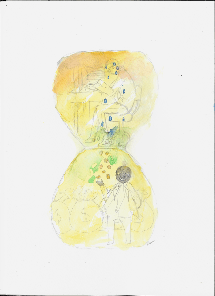 Durante la creación de este trabajo, decidí preguntar opiniones de cercanos sobre como sentían o que pensaban sobre la identidad de Chile. Finalmente, siempre recaía en la desigualdad, fue en una de esas conversaciones que se me ocurrió esta idea, recordando una frase que mi Padre ha dicho previamente: «[En Chile] Los ricos se hacen más ricos y los pobres más pobres.» Además de «estrés y horas excesivas de trabajo para un sueldo que apenas alcanza.» Teniendo ambas ideas en mente, visualicé un reloj de arena, porque todo el esfuerzo de muchos en sus trabajos termina solo favoreciendo a los empresarios, gente de mayor clase socioeconómica y de puestos altos, en vez de ser algo equitativo.