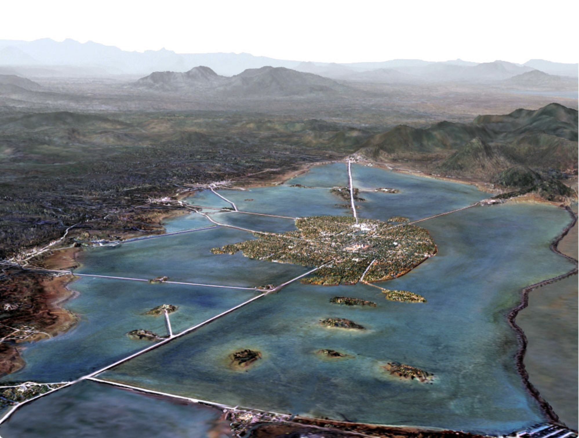 Tenochtitlán, la capital de los aztecas era una ciudad de hermosa arquitectura, preciosos jardines y con más habitantes que muchas de las ciudades europeas de su época (200 mil), tenía además agua corriente, cosa prácticamente desconocida en Europa. El asombro español expresado por los cronistas que conocieron la ciudad en el siglo XVI narran el concierto y el tamaño de la capital mexica y el grado organizativo de las funciones sociales de la misma. Muchos de los soldados de Cortés no conocían hasta entonces una ciudad tan grande. Un vistazo a Tenochtitlán pudo haber mostrado un sinnúmero de canoas (unas 60 000 un día de actividad normal) yendo y viniendo desde el centro hasta las márgenes de los lagos y una ciudad con cerca de cincuenta grandes edificios que destacaban por encima de las casas que por lo general eran de un solo piso.Tenochtitlán estaba cruzada de lado a lado por tres amplias y largas avenidas (calzadas) que se extendían hasta tierra firme: al norte la que iba a Tepeyacac y que iniciaba en la Puerta Cuauhquihuac; al poniente la que iba a Tlacopan (por donde huyeron expulsadas las tropas de Cortés) y que iniciaba fuera del islote en el puente conocido como Chichimecapan (aproximadamente en el cruce de las actuales calles de Hidalgo y paseo de la Reforma); la calzada al sur que iba a Ixtapalapa y que atravesaba la puerta Tepantzinco que la dividía del Templo Mayor, dos acequias, los acueductos de Ahuízotl y Acuecuezcatl a la altura de Acatlan (cerca de la ermita de San Antonio Abad) y salía al lago en Tlamacoyan. Al oriente no existía calzada ya que el límite era el Embarcadero Texcoco, que comunicaba a dicha ciudad con la ribera oriente. Paralelos a estos canales siempre había una amplia calle.Los canales se usaban para el transporte con barcas hechas de totoras. Había barcazas para la recolección de desperdicios y otras para la recolección de excremento, que era utilizado como abono en las chinampas. Alrededor de 1000 personas estaban encargadas de la limpieza de las calles. Bernal Díaz del Castillo comenta su sorpresa al encontrar letrinas en las casas particulares, en el mercado público y en los caminos. Los canales se cruzaban por puentes de madera que de noche eran retirados, como forma reguladora de las corrientes del lago y como estrategia militar.