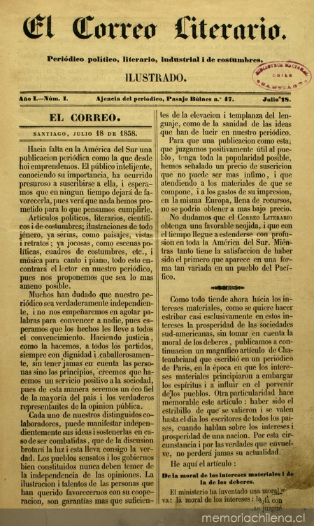En ese contexto la ilustración tuvo un papel importante, ya que ilustraciones acompañaron a estos relatos que fueron forjando la idea de estado nación chilena, de la mano con un incipiente desarrollo de la imprenta tipográfica en Chile en el siglo XIX, que posibilitó la profileración de publicaciones con cliches de tipos móviles, en talleres artesanales pequeños de carácter familiar, donde se publicaron almanaques, libros, folletos, revistas y periódicos, entre ellos El Correo Literario, primer periódico ilustrado de caricaturas en Chile, en que dibujaron Antonio Smith entre otros.